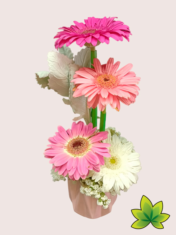 Arreglo floral con 4 gerberas en tonos rosa y blanco con follaje fino.
