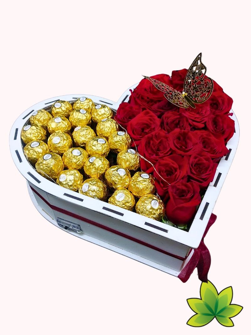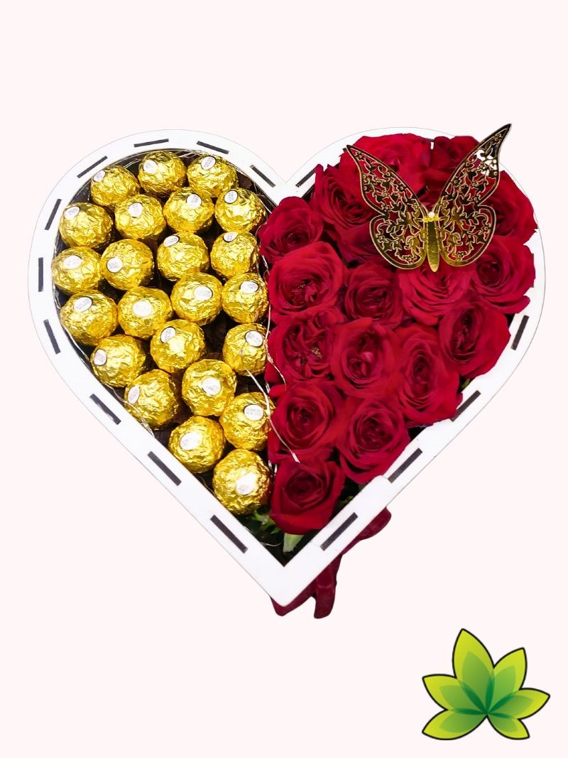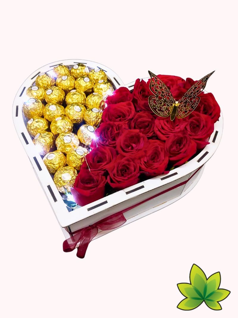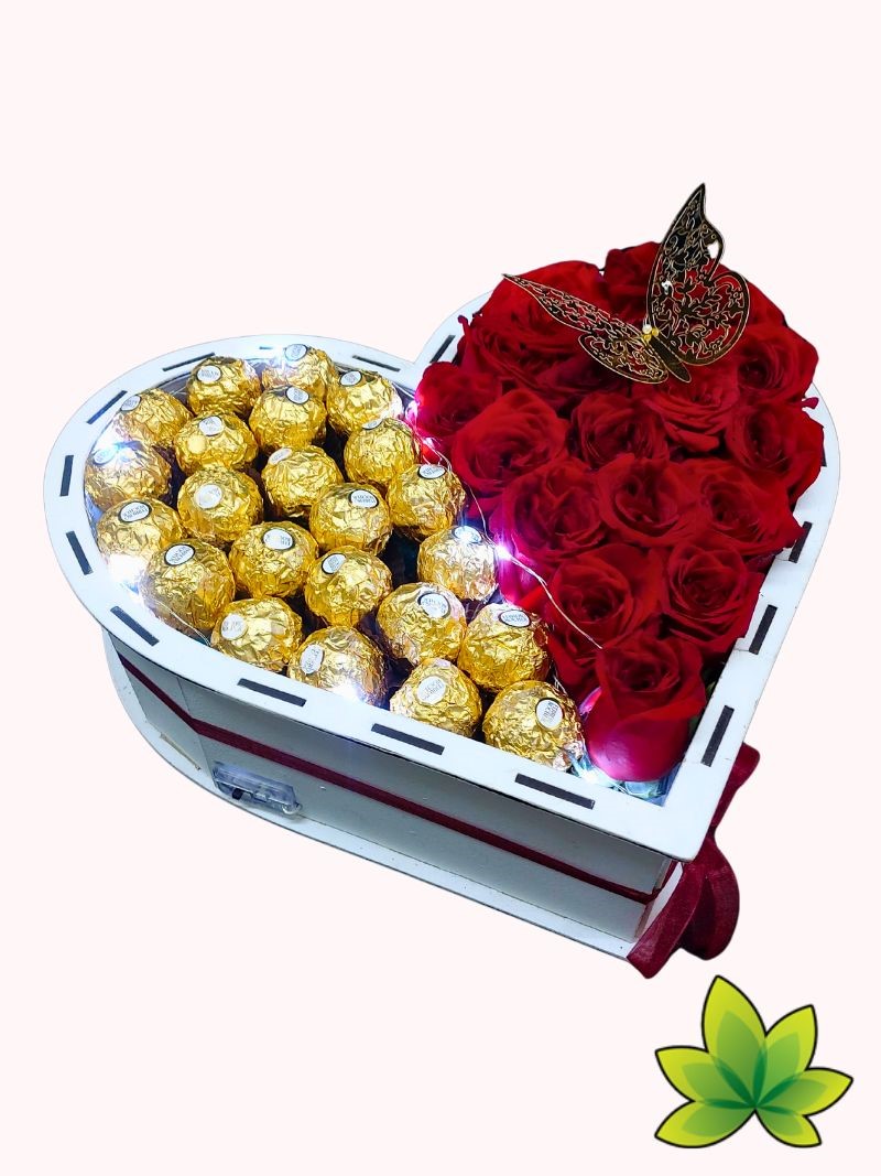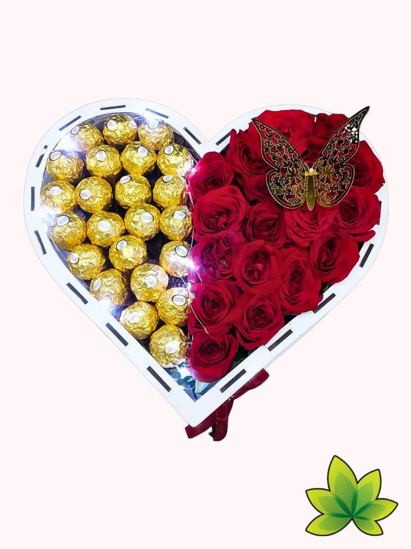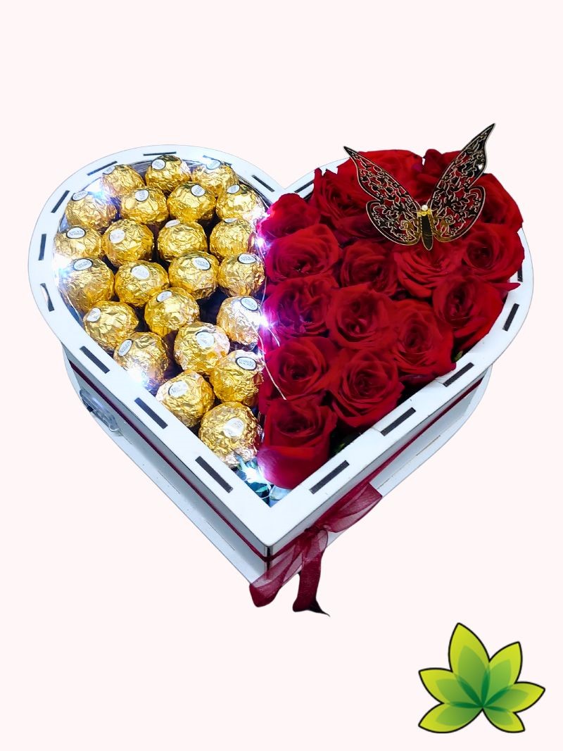 Sorprende a tu ser amado con un arreglo floral en forma de corazón que combina la elegancia de las rosas, la dulzura del chocolate y la magia de las luces LED. Diseñado para parejas que desean celebrar su aniversario con un regalo inolvidable, este exquisito detalle fusiona la belleza natural con un toque moderno y romántico.