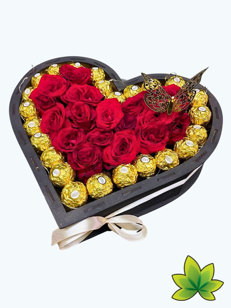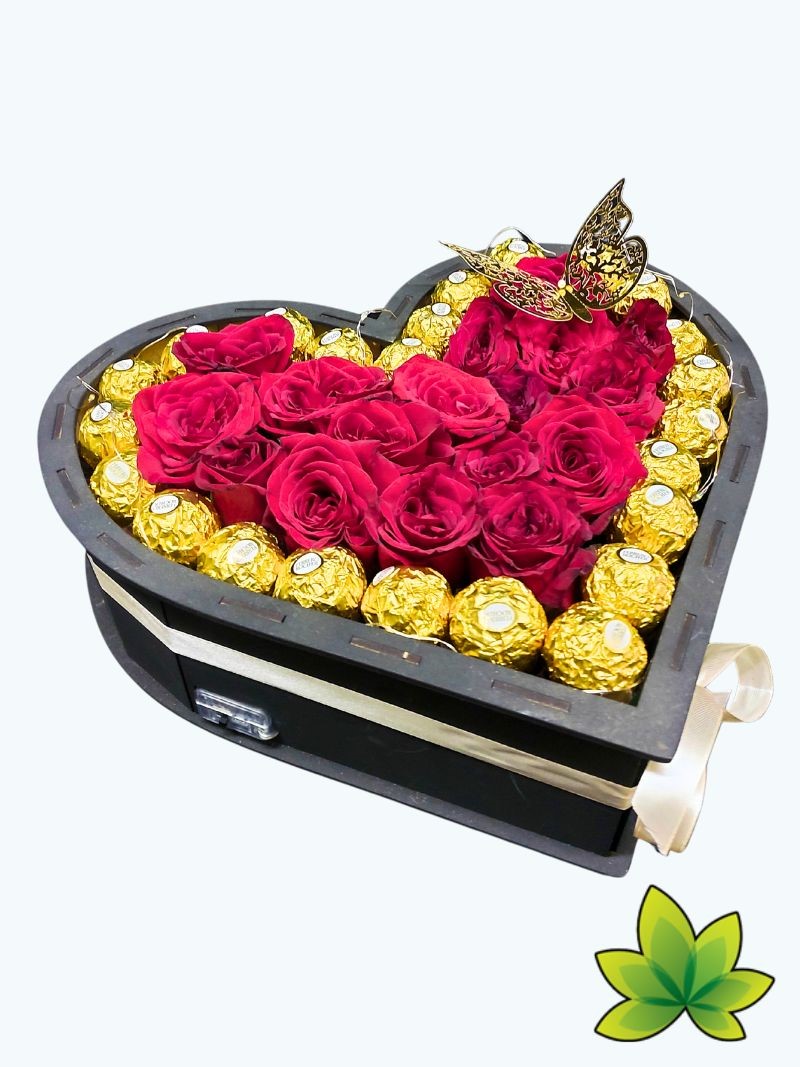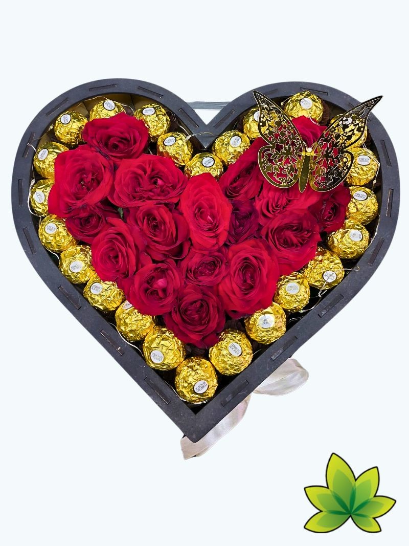 Sorprende a tu ser amado con un arreglo floral en forma de corazón que combina la elegancia de las rosas, la dulzura del chocolate y la magia de las luces LED. Diseñado para parejas que desean celebrar su aniversario con un regalo inolvidable, este exquisito detalle fusiona la belleza natural con un toque moderno y romántico.